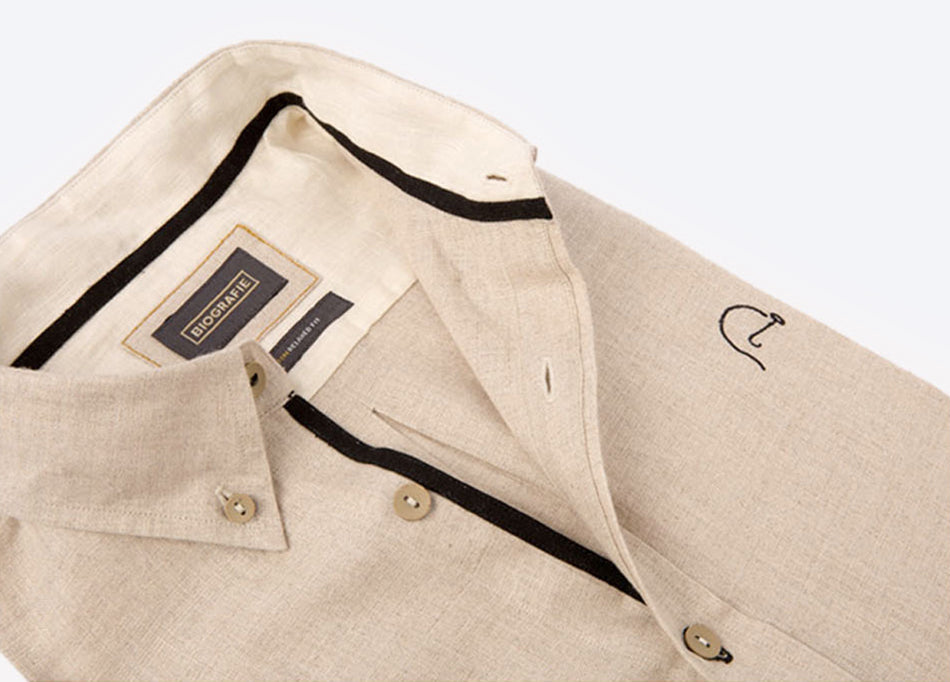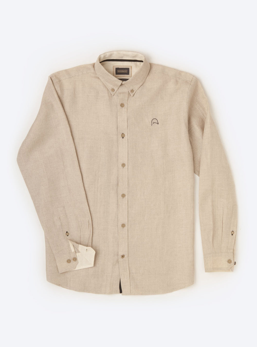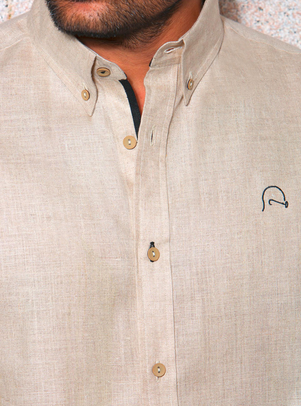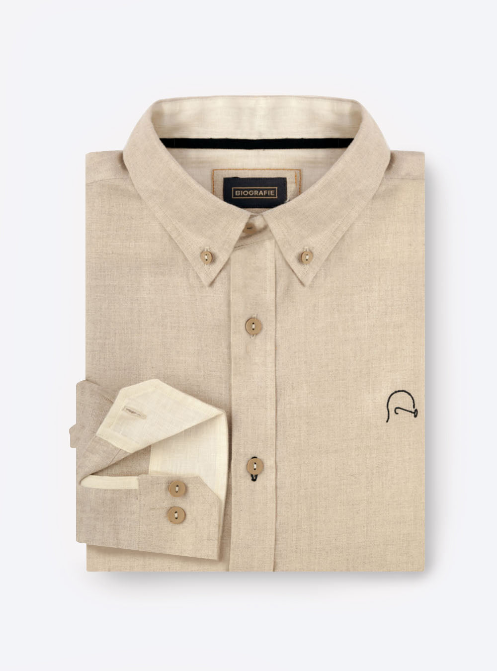 The man that was the Mahatma, finds a place in our lives in another small way, with this deftly embroidered outline of Gandhiji. His thoughts echo in the ticker tape “Where there is love there is life’, serving as reminder to always choose to do the kinder, nicer option that life brings. The sandy “The Beach Boys’ coloured shirt features a standard collar and single-button cuffs.