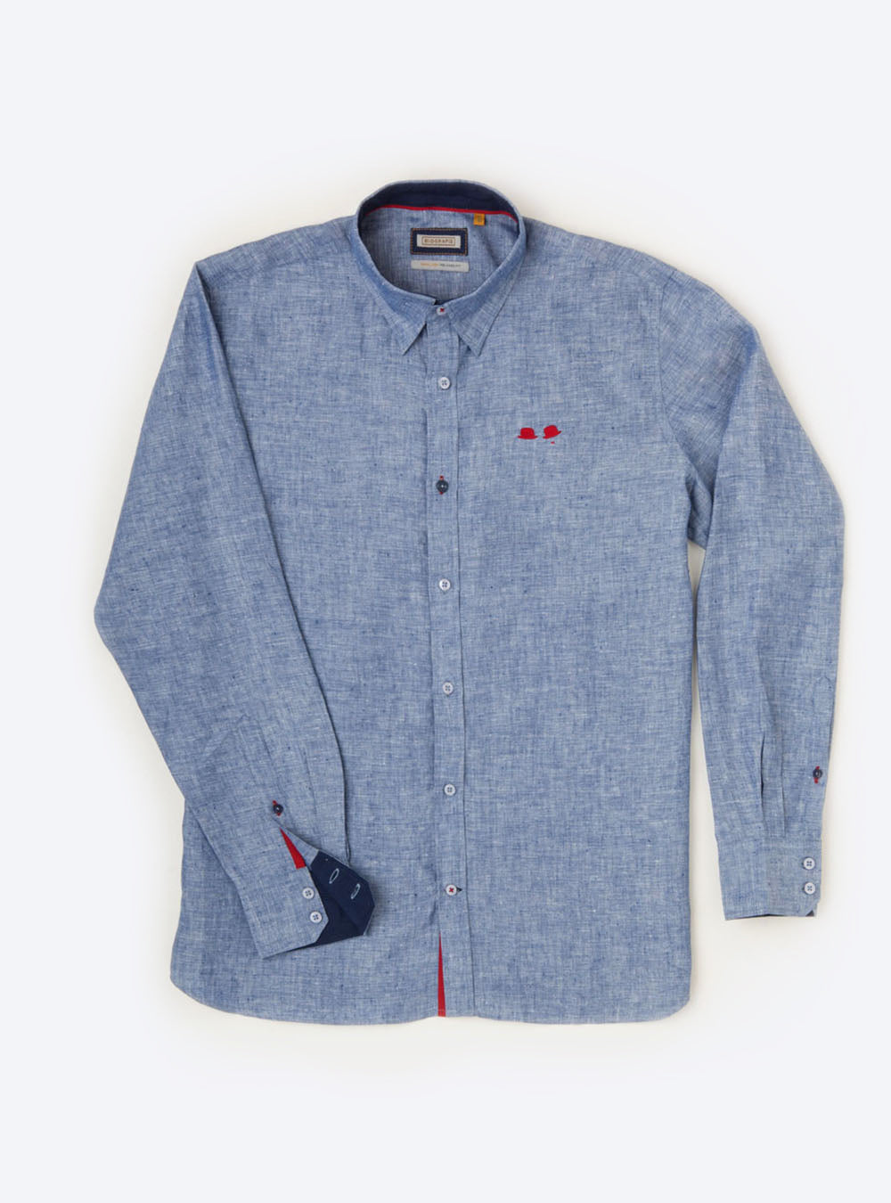 Say hey to the Kings of comedy, but in colour with Laurel and Hardy icons embroidered on your shirt! The befitting ticker tape reads “That’s another fine mess you’ve got us into”, making it a fun pick for outings, dinner with the boys and even perhaps a blind date. Coloured in the shade ‘Sunny Deol, the collared, concealed button down shirt has two-button cuffs.